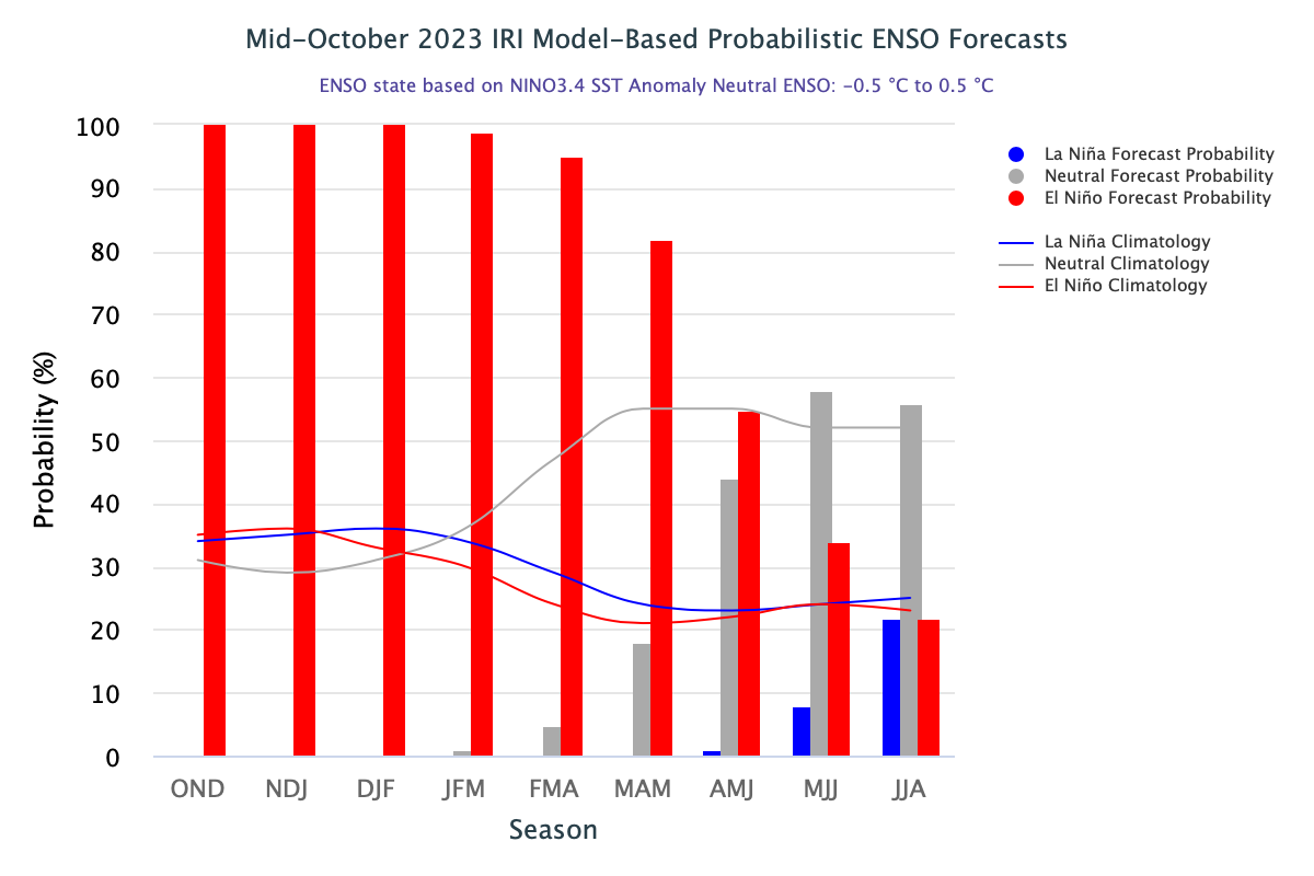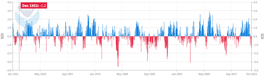 The SOI is one measure of the large scale fluctuation in the air pressure occurring between the western and eastern tropical Pacific. The negative phase of the SOI represents below normal air pressure at Tahiti (Australia) and above normal air pressure at Darwin ( Australia). The strongly negative margin seen earlier seem to be shrinking. The monthly average of SOI has dropped to -0.5 in October from the seasonal high of -1.3 in September 2023. SOI is more vulnerable to fluctuations and need to be observed for longer durations.