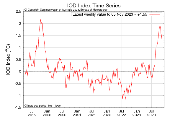 IOD : Like Nino 3.4, Dipole Index is also fluctuating. The IOD index was +1.55°C for the week ending 05Nov 2023, a significant rise from its earlier mark of +1.36°C on 29Oct 2023. The IOD index has been above the threshold value of +0.4°C for the last 12 weeks. Accordingly, 2023 qualifies as positive IOD event year. IOD event typically starts around May and peak between August and October. It rapidly decays when the monsoon arrives in the Southern Hemisphere around the end of ‘spring’ (SH). During positive IOD, westerly winds weaken along the equatorial Indian Ocean, allowing warm waters to shift towards Africa. Such temperature distribution is good for rains over Southern Peninsula and leads to poor rainfall in Australia.
