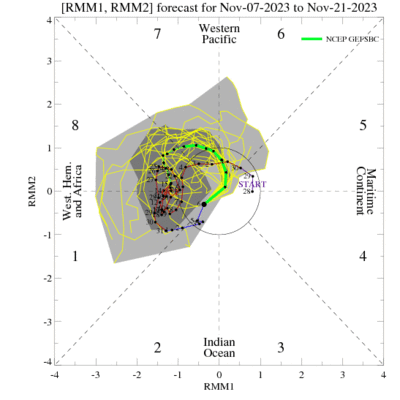 MJO: The Madden-Julian Oscillation is nearly indiscernible. The weak pulse is likely to exit the Indian Ocean and go around the Maritime Continent with a compact amplitude. The transient feature will sail across West Pacific, which otherwise has finished its peak cyclone season, normally observed between May and October. No storm is likely to form over the Indian seas, till the 3rd week of November.