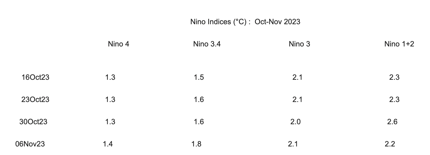 ENSO: During the last 4 weeks, above average SST’s have strengthened near the Date Line. Earlier, Nino 3.4, the principal indicator for assessing, monitoring and predicting El Nino, showed signs of plateauing with index hovering around 1.5°C and 1.6°C for nearly 8 weeks. However, this index seems still not done and dusted, as the temperature anomaly has risen significantly to 1.8°C, as on 06thNov 2023.