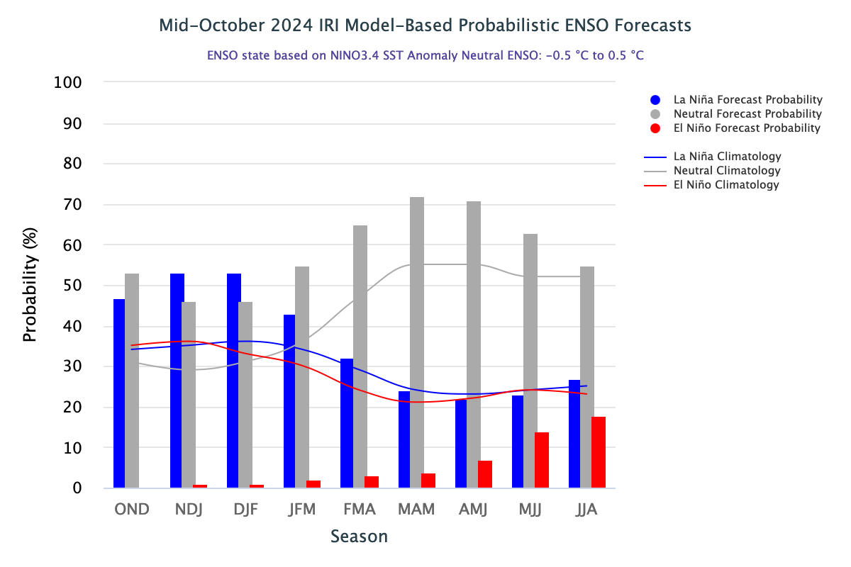 IOD: The latest Indian Ocean Dipole index value for the week ending 27th Oct 2024 was -0.94°C. This is the largest negative value since August 2022 and also, the fifth straight week of close to or below the negative threshold of -0.4°C. The IOD index seems to be slipping into the strongly negative domain. All the models corroborate that the index will meet or exceed the negative threshold in Nov-Dec 2024.