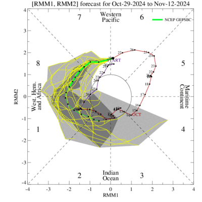 MJO: The Madden-Julian Oscillation is fairly strong in the Western Pacific. It is getting manifested as increased stormy activity in the region. Right now, there is a strong typhoon ‘Kong-Rey’ in the Philippines Sea and a tropical depression, a remnant of storm ‘Trami’ in the South China Sea. The MJO pulse will continue to move eastward and weaken slightly, as it reaches Western Hemisphere and Africa in Phases 8 & 1, over the next fortnight.