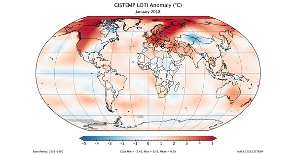 January 2018 was about +0.78°C warmer than the average temperatures. Januarys warmer this were in 2017 (+0.97°C), 2016 (+1.16°C), 2015 (+0.81°C), and 2007 (+0.95°C), the warmest being January 2017. As far as the East Coast of North America is concerned, it was 1-2 degrees Celsius below the normal levels while the entire continent was a whopping 5 degrees warmer than usual.