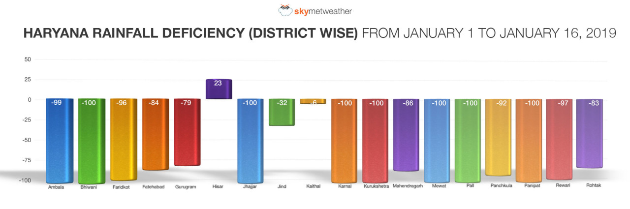 Haryana is an agrarian state that nurtures and grows major crops such as rice, jowar, bajra, maize, wheat, barley, gram, mustard, cotton and sugarcane. The state is also a home to a lot of farmers who put their heart and soul every year to bring major yield in terms of agricultural produce. We all know that weather plays an important role in governing agricultural production of the country including winter rains in months of January and February. These rains hold a major stake in determining the crop yield for state. However, this year rains have not shown up for most parts of the state. More than half of January has passed away but no significant rainfall activity has been recorded over the state. As a result, most places are presently deficient, largely deficient or have been reported with zero rains.