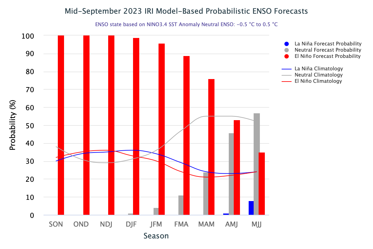 Nino indices remain above the threshold mark. The principal indicator Nino 3.4 remains nearly stable at >/= 1.5°C for the last 6 weeks. El Nino is anticipated to continue through the Northern Hemisphere winters with more than 95% chances through Jan-Mar 2024. At longer leads, the skill of the models degrades because of inherent limitations of initial conditions and differing model physics.