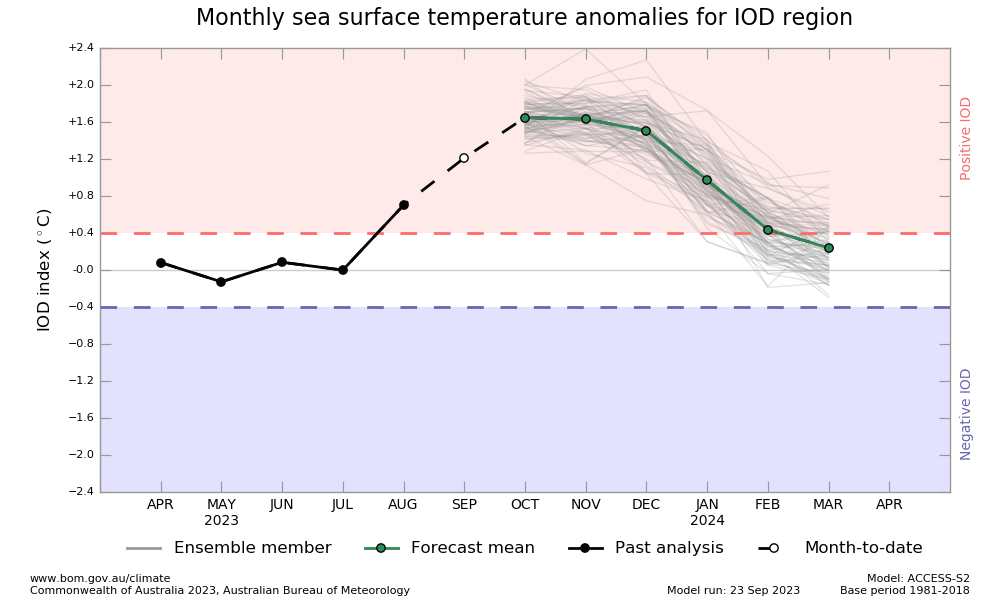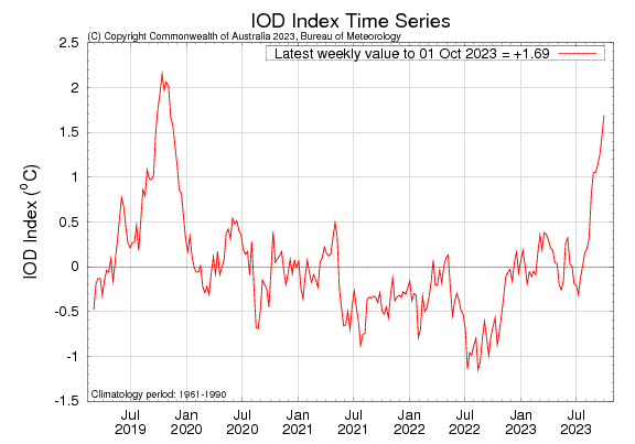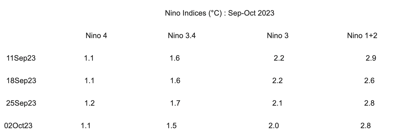 IOD: A positive Indian Ocean Dipole is underway. The IOD index has risen sharply and the weekly value ending 01 Oct 2023 was + 1.69°C. This is the 7th week above the positive threshold of +0.4°C. Consecutive 8 weeks positive IOD above the threshold value qualifies for an IOD event. Last year, the IOD was negative during the monsoon season. Mostly both, the -VE and +VE IOD events are followed by neutral IOD. Yes, 2023 is likely to be an aberration with positive IOD event, preceded by negative IOD. An IOD event usually start around May-June, peak between Sep-Oct and the rapidly decay during fall of the year.