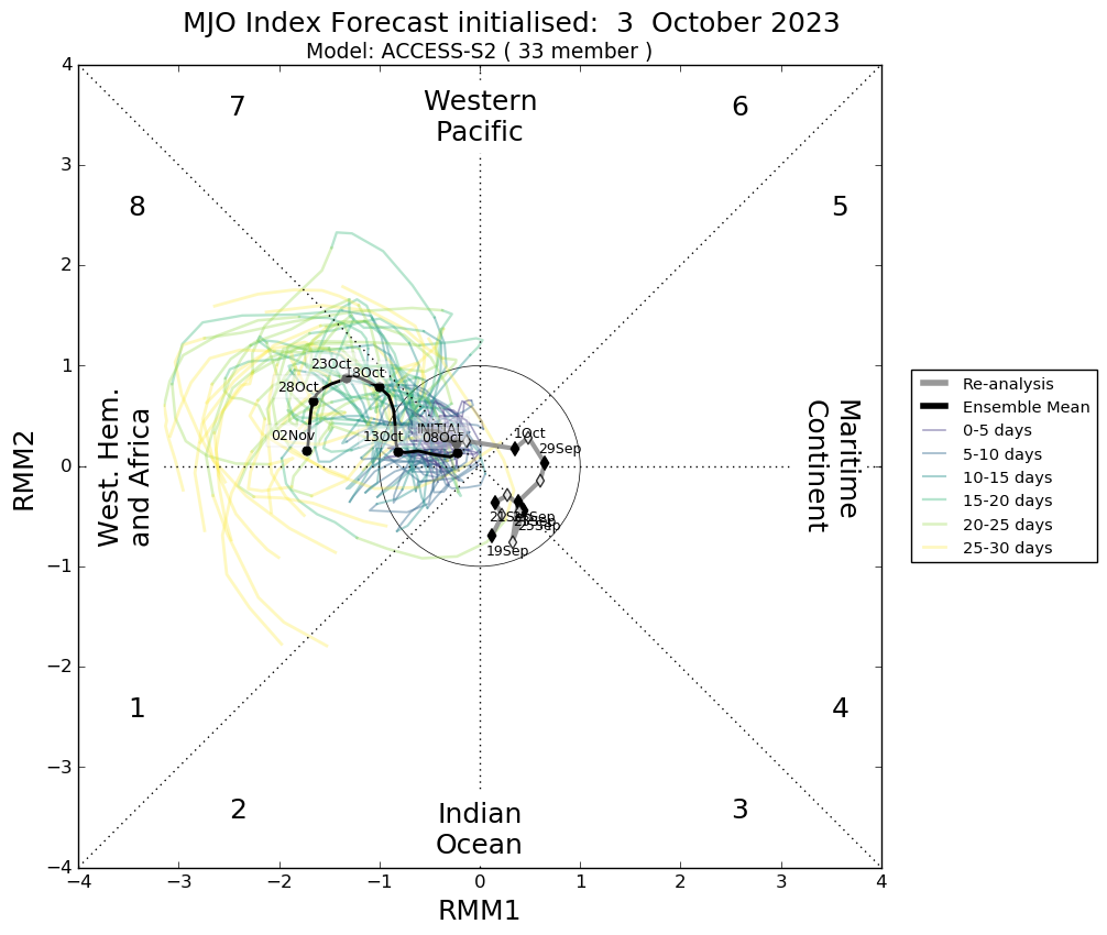 MJO: Madden-Julian Oscillation pulse is likely to be weak till 2nd week of October 2023. Thereafter, it is likely to propagate slowly to the Western Hemisphere in Phase 8&1. The Western Pacific and the Indian seas, typically have reduced tropical cyclone activity during such positions. The MJO is the major fluctuation in tropical weather on weekly to monthly time scales. It is typically represented by an eastward moving ‘pulse’ of cloud and rainfall near the equator, with a cycle of 30-60 days.