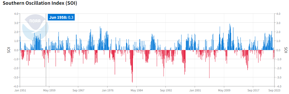 ENSO: As of September 2023, El Nino conditions in the central and eastern Pacific Ocean have strengthened further. Key oceanic and atmospheric variables are consistent with a moderate El Nino event . The Southern Oscillation Index (SOI) representing atmosphere has become increasingly negative. Courtesy triple dip La Nina, the SOI remained positive for nearly 3 years between 2020 & 2022. Signs of reversal started only in May 2023. The average value of SOI for September 2023 stands at -1.3, the highest since Feb 2016.