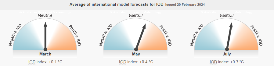 IOD: The Indian Ocean Dipole has crashed to become negative neutral. The index value for the week ending 18th Feb 2024 was -0.05°C. The IOD is likely to remain neutral until, at least April, consistent with the annual cycle of IOD. Most numerical models like BoM, ECMWF, and UKMO indicate IOD to remain neutral, till July 2024. It means that IOD may not outrightly support Monsoon 2024. But, it will not have any adverse effect, either. The graph of the previous year is rarely repeated in the succeeding season and therefore, the IOD may just hold neutral status throughout the monsoon season.