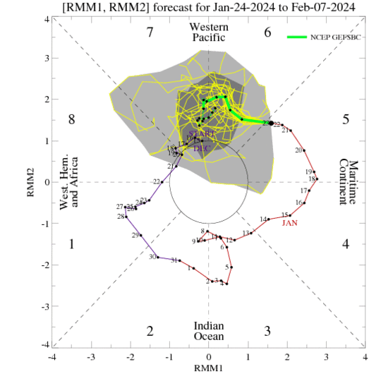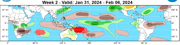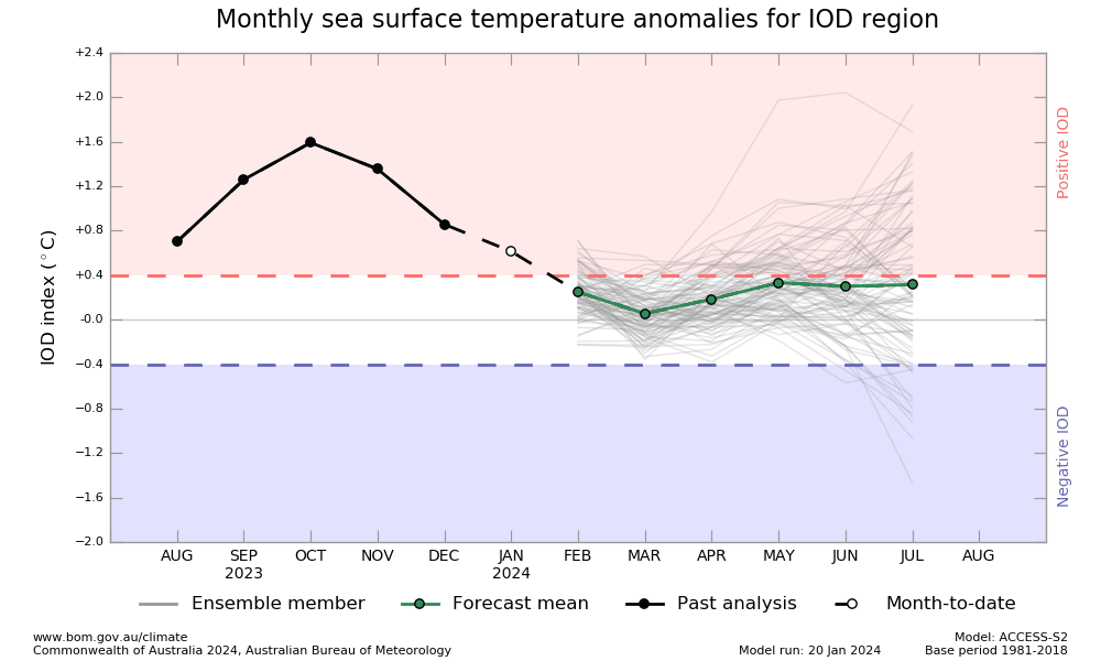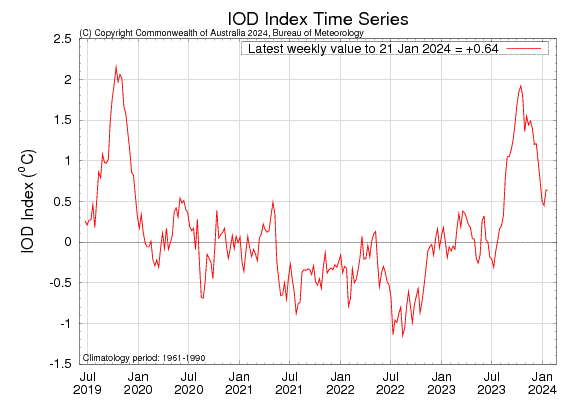 IOD: Sea surface temperatures were warmer than average across much of the western half of the tropical Indian Ocean. The breakdown of the event commenced in Dec 2023. Courtesy strength of IOD and the power of El Nino this season, this breakdown has been later than usual. Also, the process of normalization is topsy-turvy. Sustainable cooling will happen but not without restraint. The IOD index is 0.64°C for the week ending 21 Jan 2024, similar to the previous week. The event is nearing its end and the anomaly may crash below the threshold, anytime soon.