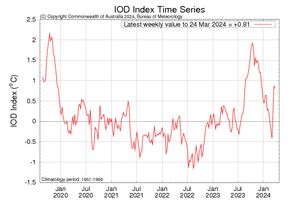 The Indian Ocean Dipole index has remained above the positive IOD threshold for the 2nd consecutive week. The most recent value of the index for the week ending 24 March 2024 was 0.81°C, narrowly below the last week mark of 0.86°C. Sustained values of IOD index above the threshold are required for an IOD event to form. Process of IOD formation, leading to monsoon 2024, may commence in another 3-4 weeks. IOD events are typically unable to form between December and April, when the ITCZ is located south of equator from Australia-Indonesia to southern parts of West Tropical Indian Ocean.