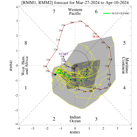 MJO: Madden-Julian Oscillation is transiting through the Western Hemisphere and propagating eastward in Phase 2&3 over Indian Ocean. Amplitude is shrinking and getting barely confined to the inner circle. The upcoming suppressed phase of MJO may tend to impede the tropical cyclone activity, if any. Afterall, month of April hosts fair number of tropical cyclones in the Indian seas, more so over Bay of Bengal.