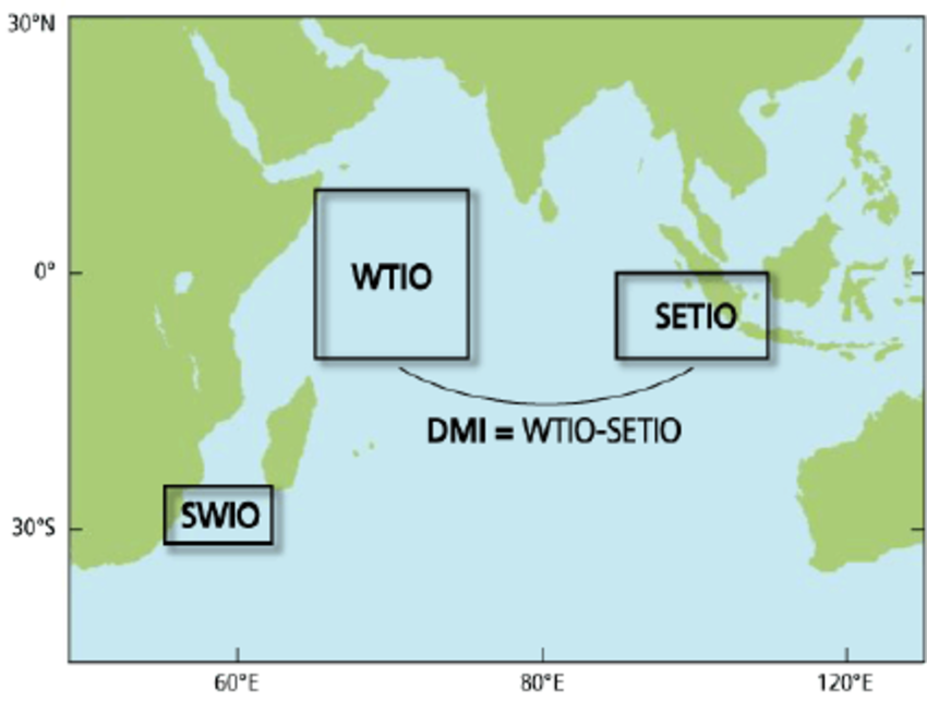 IOD: Indian Ocean Dipole is a coupled ocean-atmosphere phenomenon in the Indian Ocean. IOD also called as DMI, is the temperature difference between West Tropical Indian Ocean and Southeast Tropical Indian Ocean. Positive IOD is characterized by anomalous cooling of SST in the Southeast Equatorial Indian Ocean and anomalous warming of SST over the Western Equatorial Indian Ocean. Associated with these changes, the normal convection situated over the Eastern Indian Ocean warm pool shifts to the West and bring heavy rainfall over the East African region and droughts over the Indonesia region.