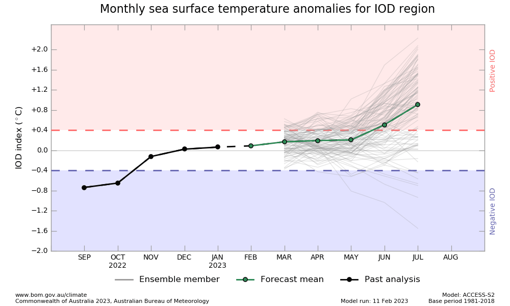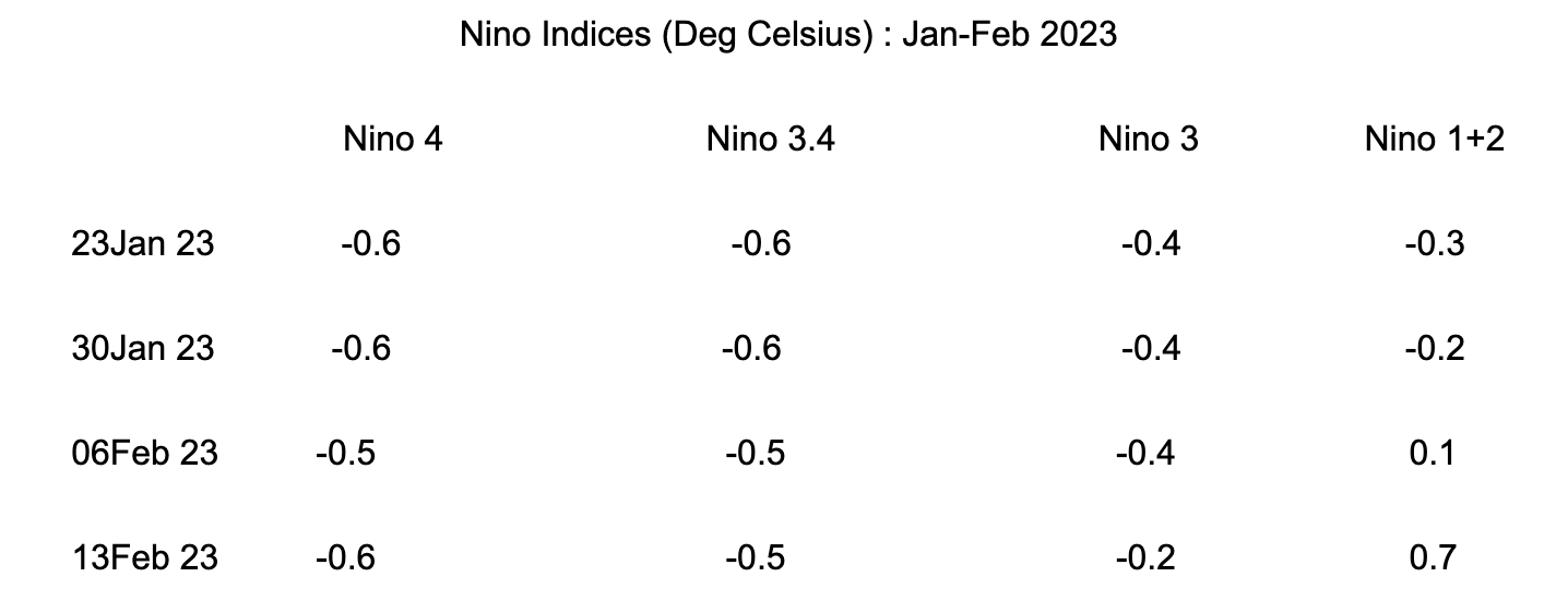 Indian Ocean Dipole index value for the week ending 12 Feb 2023 was -0.05 degree. But these are still early days . IOD projections do indicate the index crossing threshold of + 0.4 degree in June 2023 and stay +ve thereafter.