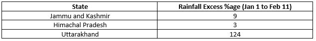 सर्दियों में चारों पर्वतीय क्षेत्रों में जम्मू कश्मीर में सबसे अधिक बारिश होती है। हिमाचल प्रदेश दूसरे स्थान पर जबकि उत्तराखंड तीसरे स्थान पर आता है। नीचे दिए गए टेबल में 1 जनवरी से 11 फरवरी के बीच रिकॉर्ड की गई बारिश का आंकड़ा देखा जा सकता है।