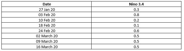 वर्ष 2019 में सितंबर के मध्य से अब तक के आंकड़े देखें तो प्रशांत महासागर सामान्य से काफी गर्म रहा है। विशेषतौर पर नीनो 3.4 क्षेत्र में पिछली तिमाही में तापमान 0.5 डिग्री या उसके आसपास ही रहा है।