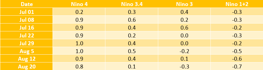 जैसा की उम्मीद की जा रही थी, अल नीनो ने जुलाई में ही भूमध्य सागर की सतही तापमान (एसएसटी) में लगातार उतार-चढ़ाव के साथ गिरावट का रुख दिखाना शुरू कर दिया था। हालांकि मूल्यों में कमी के बाद, एसएसटी फिर से बढ़ गया था, लेकिन जल्द ही इसके बाद गिरावट आई। और, लगातार तीसरे सप्ताह एसएसटी में गिरावट जारी है। इस सप्ताह में एक महत्वपूर्ण गिरावट देखी गई जिसमें एसएसटी 0.4 डिग्री सेल्सियस से 0.1 डिग्री सेल्सियस तक नीचे चला गया।