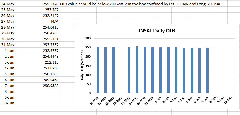 मॉनसून की शुरुआत के कड़े मानदंड हैं, जिसमें सीमांकित क्षेत्रों पर निर्धारित वर्षा, बादल और हवाएँ शामिल हैं। केरल राज्य में कल अच्छी बारिश हुई और पश्चिमी हवाएं भी गहराई और गति दोनों में संरेखित हो रही हैं। जबकि OLR (आउटगोइंग लॉन्गवेव रेडिएशन) <200wm~ के थ्रेशोल्ड मार्क तक पहुंचने के लिए संघर्ष कर रहा था, भूमध्यरेखीय क्षेत्र में वांछित विंडो पर शीट बादलों की मोटी परत के लिए परिस्थितियाँ अनुकूल थीं। जल्द ही किसी भी समय दक्षिण-पश्चिम मॉनसून की शुरुआत के लिए मंच तैयार किया गया था।