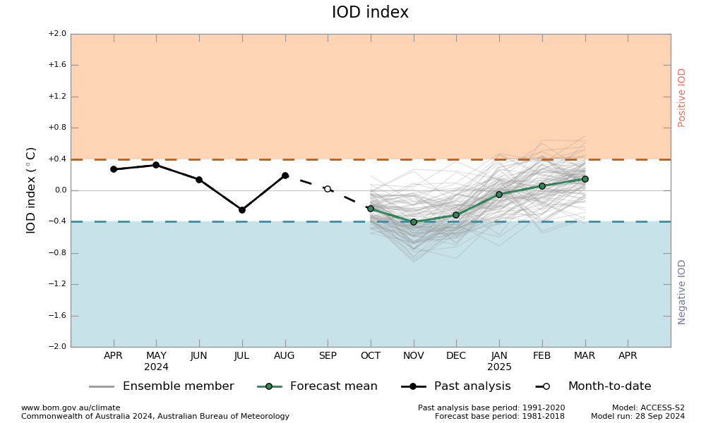 IOD: The Indian Ocean Dipole is neutral. The IOD index for the week ending 06 Oct 2024 was -0.35°C, still very close to the negative threshold mark. Most climate models indicate, that the IOD is likely to remain neutral, but weakly negative for the rest of the year. The IOD forecast skill has historically been low at this time of the year. Even, with the latest simulation techniques, IOD is difficult to predict several months in advance.