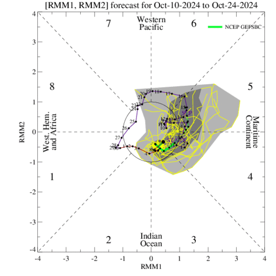MJO: Unlike a standing pattern like the ENSO and IOD, the Madden- Julian Oscillation is a travelling pulse that propagates eastwards at approximately 4-8m/s, through the atmosphere above the warm parts of the Indian Ocean and Pacific Ocean. This overall circulation pattern manifests itself more clearly as anomalous rainfall. In the first week of October, the MJO was positioned across the Western Hemisphere, leading to an uptick in the tropical cyclone activity, across the North Atlantic. During the second week of October, the MJO propagated eastward over the Indian Ocean. Though, the amplitude reduced but still it increased the convective activity in the equatorial region, on either side of the coastline. It is likely to sail over the Maritime Continent in Phases 4 & 5 and still remain favourable for enhancing convection. It may hasten and facilitate the early start of the Northeast Monsoon over the South Peninsula.