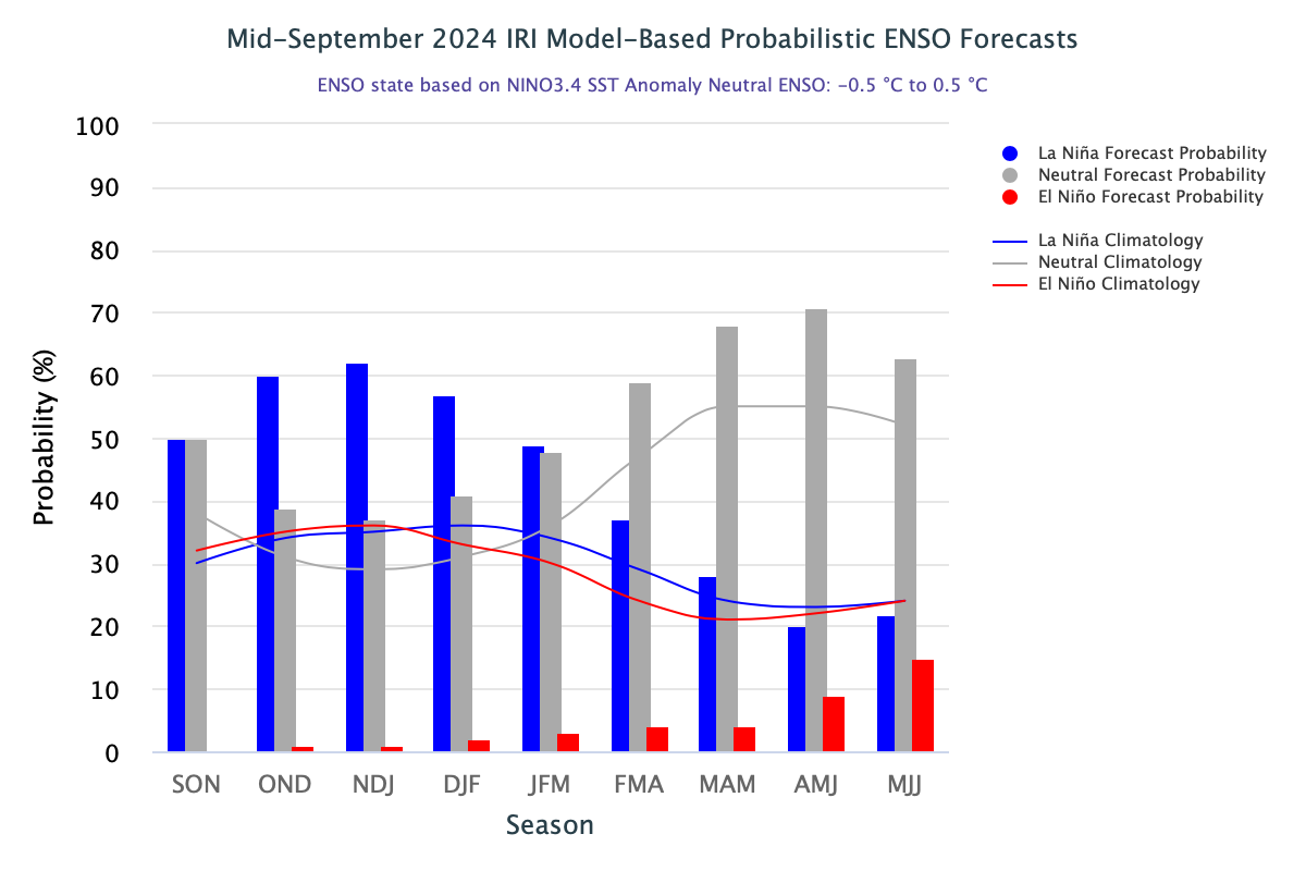 ENSO: The forecast indicates equal chances for continued ENSO-Neutral conditions in Sep-Nov and a potential transition to La Nina in Oct-Dec 2024. Thereafter, weak La Nina conditions are likely to remain dominant till Jan-Mar 2025. In Feb-Apr 2025, ENSO-Neutral becomes again the most preferred category and remains so for the remainder period of forecast. The probability of return of El Nino lies quite low. However, caution is advised in adopting these forecasts, as the skills of the models degrade at longer leads.