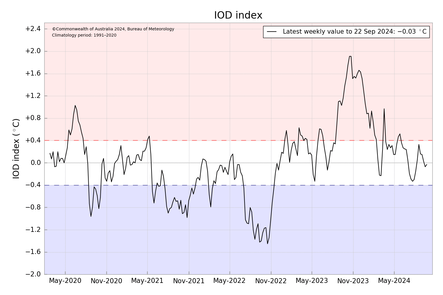 IOD: The Indian Ocean Dipole is currently neutral. For the last three weeks, on the trot, the index is hovering close to zero. The weekly IOD index value as of 22Sep2024 was -0.03°C. Most models indicate that the IOD is likely to remain neutral, but slightly negative during the fall of the year. An IOD event is unlikely.