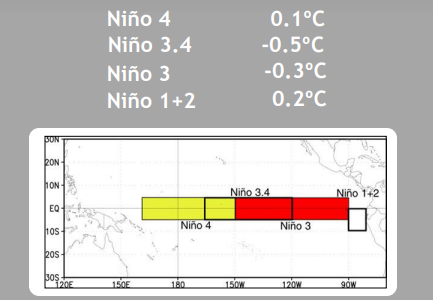 Oceanic and atmospheric conditions across the tropical Pacific favour ENSO-Neutral conditions. However, the Southern Oscillation Index display an inclination to migrate into the La Nina domain, earlier than the oceanic component. The Nino indices in the equatorial Pacific Ocean seem to be unsettled. Nino 3.4, the marker of ONI, for the first time has breached the threshold value of -0.5°C. It remains to be seen whether these conditions will be sustained.