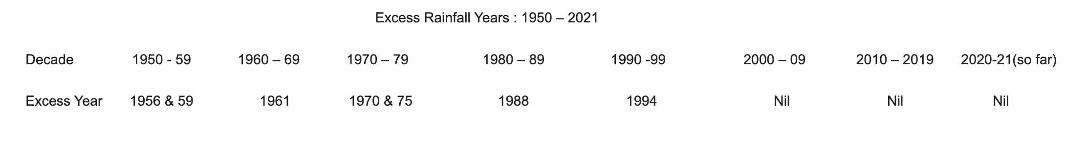 Since 1950,there have been 8 ‘Excess’ seasons and the most rainiest of these was 1961 with a surplus of 21.8%. The 2nd best being 1988 with a seasonal mark of 119.3% of LPA. From 1950 onward, there was always >/= 1 excess season in each decade. However, since the year 2000, not even a single season has recorded excess rainfall.
