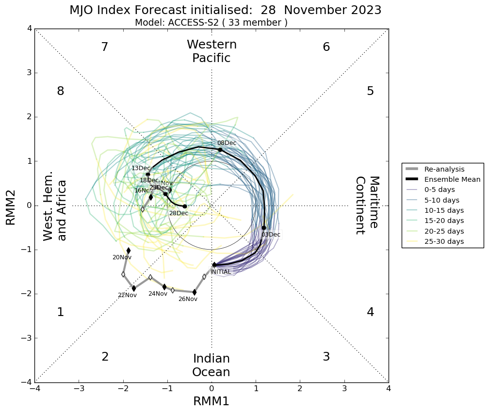 MJO: The Madden-Julian Oscillation, that has been mostly non-existent for the past several weeks has risen from the dead, over Bay of Bengal. It is expected to support cyclogenesis over Bay of Bengal till first week of December, before it travels far in the Maritime Continent with wincing amplitude. The Maritime Continent is a significant feature in the Earth’s climate system. An easterly trade wind along the ocean surface here creates a warm pool. This region, known as the Indo-Pacific warm pool persistently have a SST >/= 28°C and is often the warmest ocean region around the globe.