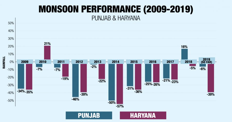 - Haryana has been a rather poor performer in 2019 till now with 39% rain deficiency. Punjab too is on a threshold with 6% rain deficiency.